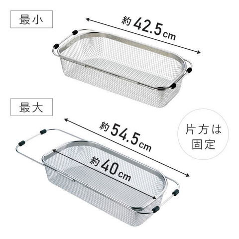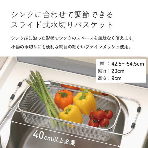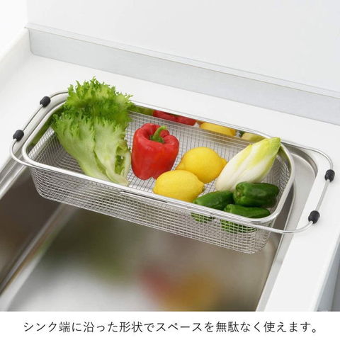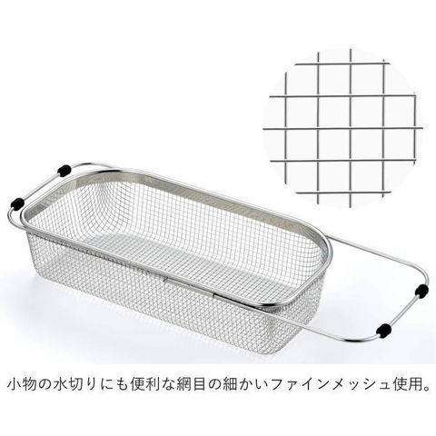 | シンクのスペースを有効活用! ・シンク端に沿った形状でシンクスペースを無駄なく使えます。 ・シンクに合わせて調節できるスライド式。 ・小物の水切りにも便利な網目の細かいファインメッシュ使用。 |