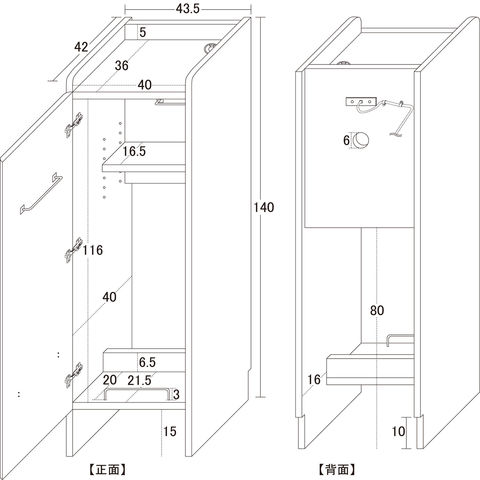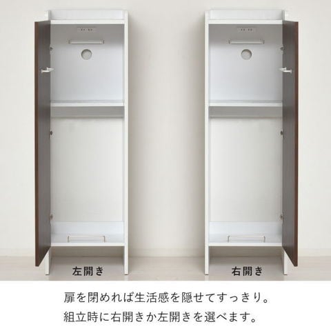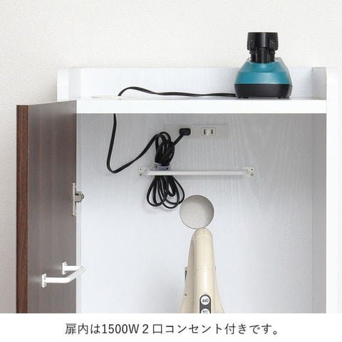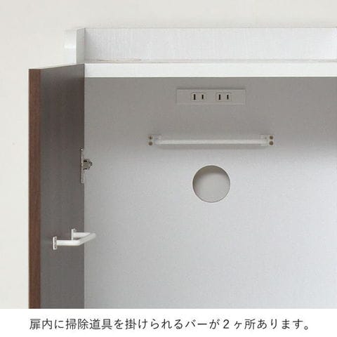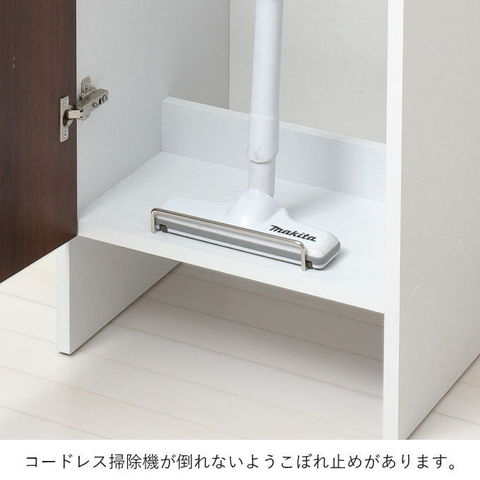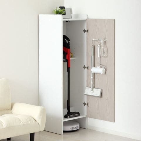 | 掃除道具や生活用品のストックをまとめてすっきり収納できます。 扉を閉めれば生活感を隠せてすっきり。組立時に「左開き」か「右開き」をお選びいただけます。 側板の角は丸く加工しているので安心です。 天板上は高さ約5cmの囲いがあり、置いているものの落下を防ぎます。 扉内に掃除道具を掛けられるバーが2か所あります。 扉内は1500W2口コンセント付きです。天板に配線穴があり、充電もできます。 扉はゆっくり閉まるソフトクローズヒンジを使用しています。また歪みの微調節もできます。 可動棚1枚付きで収納物に合わせて高さを変えられます。 コードレス掃除機が倒れないよう地板にはこぼれ止めが付いています。 地板下は高さ約15cmのスペースがあり、ロボット掃除機が入ります。また、背面にホームベースを設置することもできます。 高さ約10cm-巾木よけがあり、壁にぴったり付けられます。 掃除道具を1箇所にまとめて収納できるので、リビングに置けばすぐに使えて便利。 扉は白木目とブラウンの2色展開。本体はどちらも淡い白木目柄です。 |