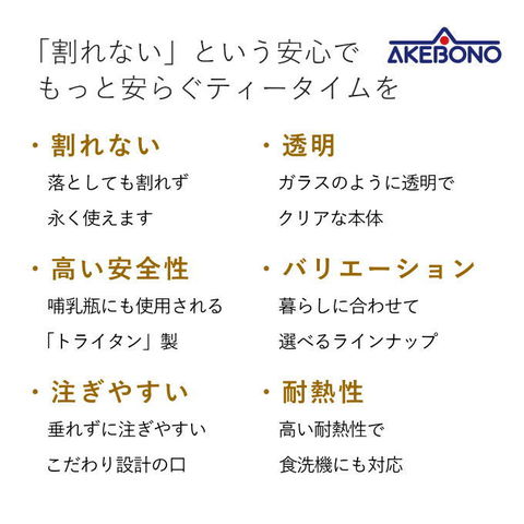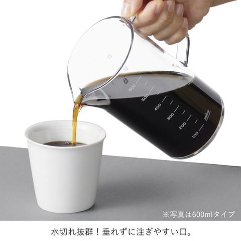 | 「割れない」安心感と、まるでガラスのような美しさ。 割れないコーヒーサーバーにスマートなビーカータイプが登場。 水切れ抜群!垂れずに注ぎやすい口。 口径が広いので、お手入れ楽々。目盛付き。食洗機対応。 割れない 落としても割れず、永く使えます ※「割れない」とは、空の状態で底部分を下にし1mの高さからフローリング床へ落下する試験(メーカー基準)によるものです。 高い安全性 哺乳瓶にも使用される「トライタン」製 Eastman Tritanコポリエステルは、卓越した強靭製、耐薬品性、耐熱性、高透明性を備えた樹脂です。BPA(ビスフェノールA)を含有せず安全性も高いため、乳児用品や医療部品にも使用されています。 透明 ガラスのようにに透明で、クリアな本体。 耐熱性 高い耐熱性で、食洗機にも対応 注ぎやすい 垂れずに注ぎやすいこだわり設計の口。 ※ドリッパーは付属しません。 |