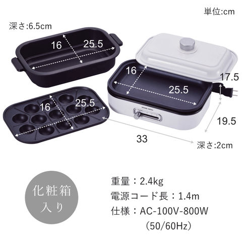 | 本体/27×19×8.5cm プレート(内寸)/25.5×16×2cm たこプレート/25.5×16 深鍋/26×16×6.5 |
