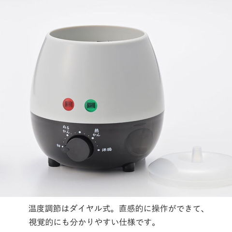 | 食事をしながらゆっくり味わいたい時に。湯煎式の電気酒燗器 緩やかに温めるため、直接お酒を温めるよりも日本酒の香りが飛びにくく、旨味や甘みが広がります。 温度調節は直感的な操作ができるダイヤル式です。 ※徳利・おちょこは付属しません。 |