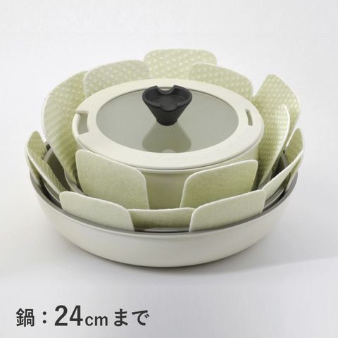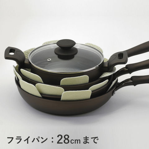 | 鍋・フライパンの収納時の傷付き防止に! 重ねた鍋やフライパンをキズから守ります。側面までしっかりガード。 フライパン:28cmまで 鍋:24cmまで |