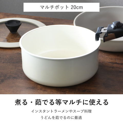 | フライパン20cm / マルチポット20cm / ガラス蓋20cm / ハンドル / ザル / ボウル / 計量カップ / ピーラー / キッチンバサミ / 包丁 / まな板 / お玉 / ターナー / 菜箸 / 計量スプーン |