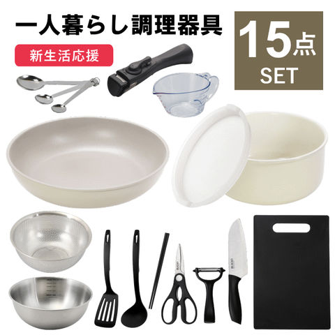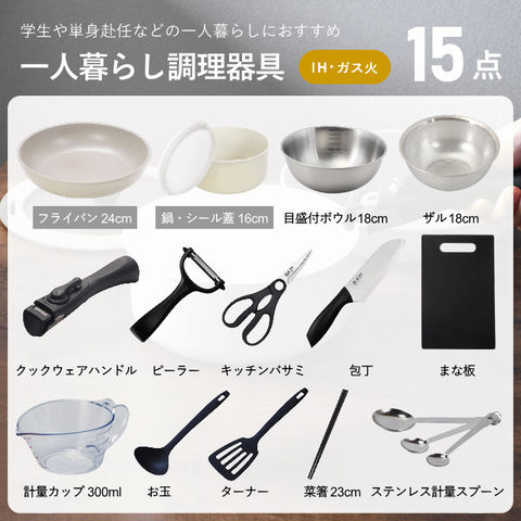 一人暮らし 調理器具 セット フライパン 鍋 白 IH 対応 取っ手が取れる キッチンセット キッチンツール 単身赴任 新生活 引っ越し おすすめ 包丁 まな板 深型 ボウル ザル ステンレス シリコン 菜箸 ギフト プレゼント