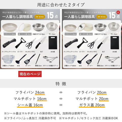 | フライパン24cm / マルチポット16cm / シール蓋16cm / ハンドル / ザル / ボウル / 計量カップ / ピーラー / キッチンバサミ / 包丁 / まな板 / お玉 / ターナー / 菜箸 / 計量スプーン |