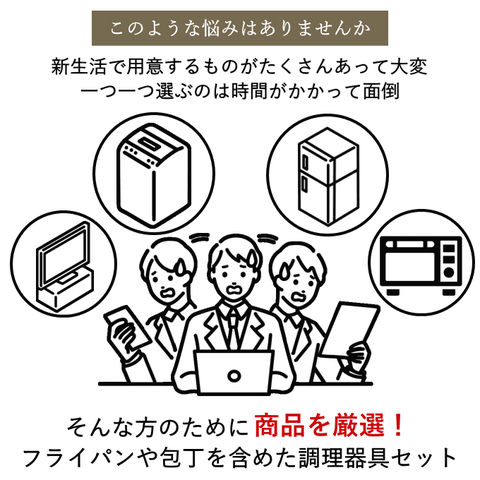 | 新生活で用意するものがたくさんあって大変といった方のために商品を厳選!フライパンや包丁を含めた調理器具セット! 耐久性抜群!強化コーティングの鍋 フライパンセット ハンドルを外してオーブン調理OK!調理できたらそのまま食卓へ出せます。洗いも簡単。コンパクトに収納できるので場所をとりません。 ハンドルは安心の2重ロック構造。 フライパンは内面ふっ素加工、マルチポットは内面セラミック加工で汚れがこびりつきにくいコーティングを施しています。 少量の油で調理可能なヘルシークッキングを実現しました。 マルチポット用シール蓋は料理の一時保管に便利。 オール熱源対応! ガス火はもちろん、IH100/200Vをはじめ、全ての熱源に対応可能です。 ステンレス・ブラックカラーで統一されたキッチンツール 鍋 フライパン以外はステンレス・ブラックカラーで統一され、スタイリッシュな印象です。 |