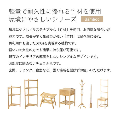 | 環境にやさしくサステナブルな竹材を使用、お洒落な風合いが魅力です。 成長が早く生命力が強い「竹材」は耐久性に優れ、再利用にも適したSDGsを実現する植物です。 ハシゴのような遊び心のある形状で、お部屋のアクセントになります。 タオルやストールなどを掛けられます。 ディスプレイラックとしてもお使いいただけます。 角を丸く加工した柔らかいデザインです。 既存のインテリアを邪魔しないシンプルなデザインです。 軽いので女性の方でも簡単に持ち運び可能です。 お部屋に馴染むナチュラル色です。 玄関、リビング、寝室など、置く場所を選ばずお使いいただけます。 |