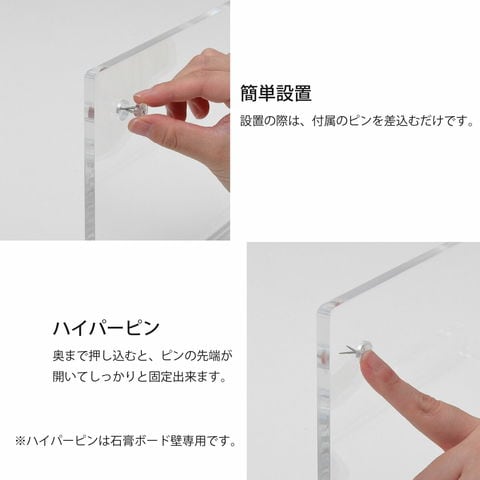 ?取付位置を決めてピンを差し込むだけです。壁に穴を開けないので、賃貸でも安心です。 ?奥まで押し込むとハイパーピンの先が開いてしっかり固定できます。 ?付属のプッシュエイドは、ハイパーピンの取り付けが固く感じる場合と、取り付けの際に使います。 ? ?透明のアクリル素材ですので圧迫感がなく、インテリアの邪魔をせずお使いいただけます。 ?壁に取り付けるので場所をとらず、洗面所やトイレなど狭い場所にも設置できます。 ?2個組ですので、並べて使ったり、別の場所で使うこともできます。 ?幅と奥行が違う4種類から用途に合わせてお選びいただけます。 ?届いてすぐに使えるうれしい完成品です。 ?お手入れは薄めた中性洗剤をご使用ください。アルコールを含む薬品はアクリルの性質上、割れる恐れがあるので使用しないでください。 |