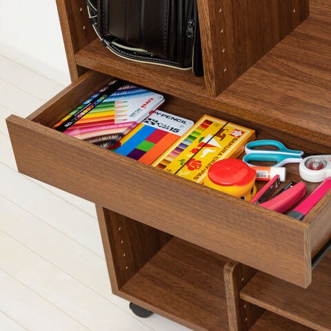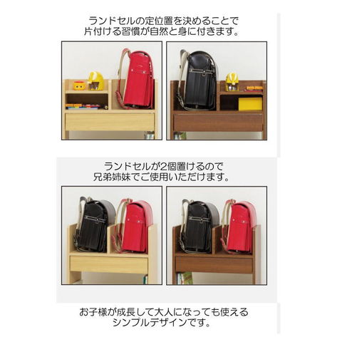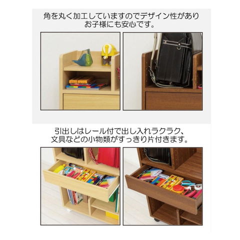ランドセルと教科書・文具をひとまとめ。 高さ76cmで低学年もラクに使えます。 ランドセル2個置きOK。可動棚2枚。 引出しレール付。背面化粧仕上げ。 キャスター付で移動も簡単。 ナチュラル/ブラウンの2色。 |