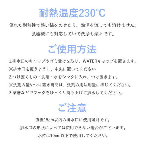 | 直径15cm以内の排水口に使用可能です。排水口の形状によっては使用できない場合がございます。 水位は10cm以下で使用してください。 つけ置き後に排水する際は、菜箸などをフックに引っ掛けて縁部に隙間を開けて少しずつ排水してください。排水キャップを一気に持ち上げたり、ずらしたりすると、排水口から空気が一気に噴出して水が飛び散るおそれがあります。 |