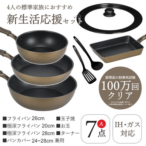 品番:P01-1-100-LONG-A-7P※品名:フライパン セット 深型 7点 IH-Aセット ih対応 ガス火 フライパンセット 深型20cm 26cm 深型28cm 玉子焼き 卵焼き器 卵焼き お玉 ターナー フライ返し 一人暮らし 調理器具 セット