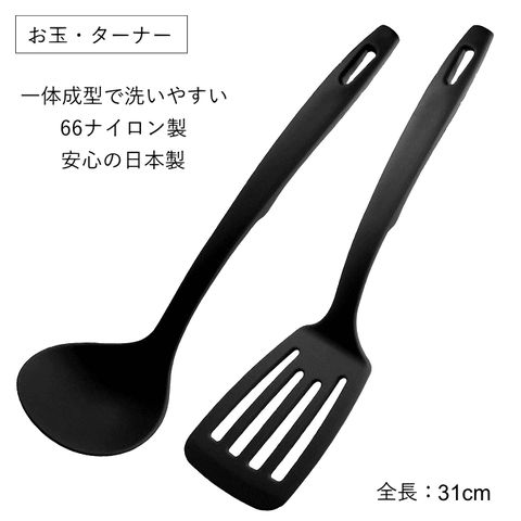 | お玉・ターナー | ■サイズ:(約)全長31×幅8cm ■重量:52g ■耐熱温度:(約) 210度 ■原産国:日本 |