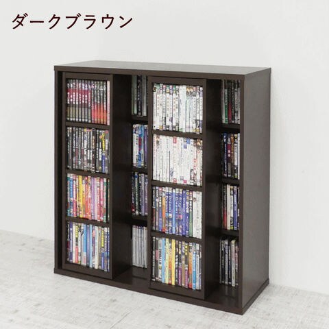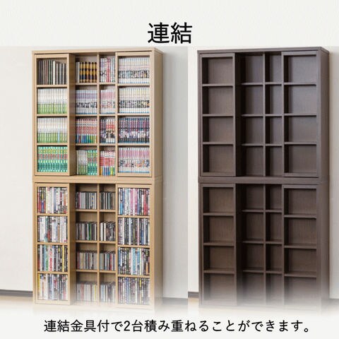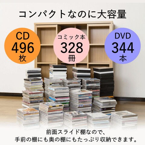 | スライド棚で奥の物も出し入れ楽々。積み重ねれば収納力2倍。連結部品付で、上下を固定できます。 お部屋に馴染むダークブラウン、ナチュラル、ホワイトオークの3色展開です。 CDで496枚、DVDで344本、コミック本で328冊収納できます。 |