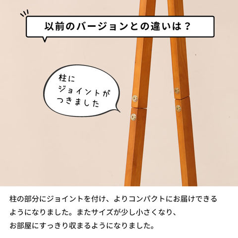 ワンタッチで楽々折畳み!金属製が多い中で天然木を使ったハンガーはナチュラル感があり、お部屋にも馴染みやすいです。 ※2019/12/11 マイナーチェンジしました。 柱部分にジョイントがつき、よりコンパクトにお届けできるようになりました。 |