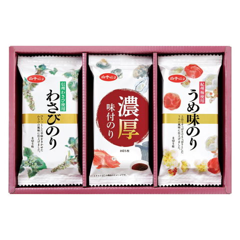 わさび味、濃厚味、うめ味の3種の味のりを詰合せたバラエティセットです。