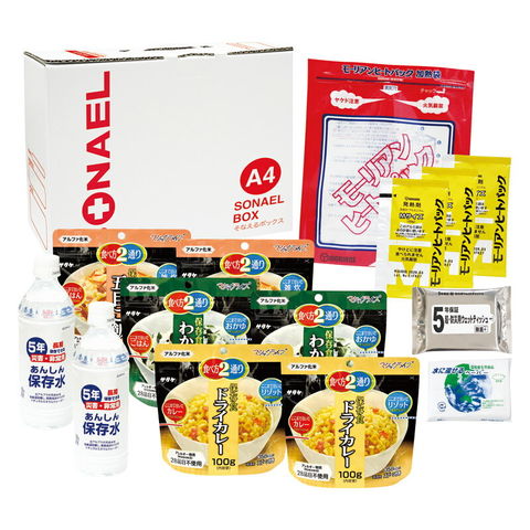 春の贈り物便り そなえるボックス14点セット 2.1kg 発熱剤×3、5年保存水(500ml)・マジックライス(わかめ・五目・ドライカレー)×各2、加熱袋・ウェットティッシュ・水に流せるペーパー×各1