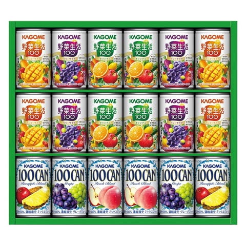 100%ジュースのベストセラー「KAGOME 100CAN」と野菜&フルーツのおいしさが人気の「野菜生活100」の詰め合わせ。