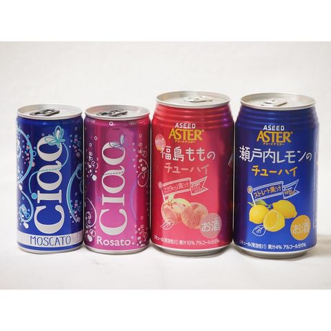 飲みきりイタリアワイン缶4本セット(イタリアチャオ モスカート 甘口微発泡白ワイン イタリアチャオ ロザート やや辛口微発泡ロゼワイン ストレート果汁瀬戸内レモンのチューハイ ストレート混濁果汁福島もものチューハイ) 300ml×2本 350ml×2本