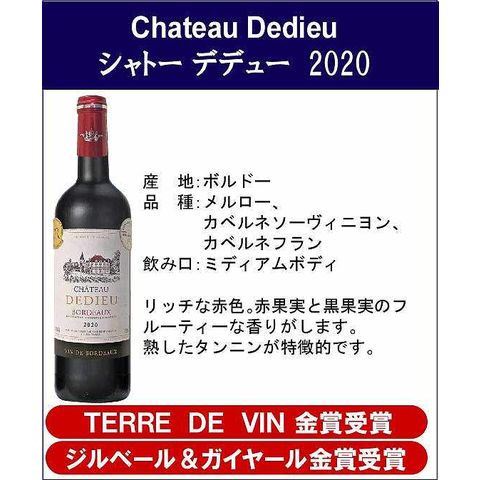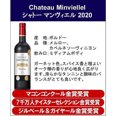フランスボルドー金賞受賞トリプル・ダブル金賞受賞赤ワイン6本セット750ml×6本  【セット説明】 ※ご注文のタイミングによっては、まれに一部の商品が変更になる場合がございます。 ※ヨーロッパには、味わいを競うコンクールが数多くあり、出展されるワインは生産者が丹精込めた自信作ばかりです。そんなワインを審査するのは、ソムリエやジャーナリストなど、ワインのプロフェッショナルです。その中から見事に、金賞を受賞したワインを詰め合わせです。 【商品内容】 ★★★シャトー デデュー 2020★★★ ジルベール&ガイヤール金賞受賞、TERRE DE VIN金賞受賞 【 品 種 】メルロー、カベルネソーヴィニヨン、カベルネフラン 【 産 地 】フランス ボルドー 【商品説明文】リッチな赤色。赤果実と黒果実のフルーティーな香りがします。熟したタンニンが特徴的です。 ★★★シャトー ル オー ド ミアーユ 2020★★★ リヨン国際コンクール金賞受賞、ジルベール&ガイヤール金賞受賞 【 品 種 】メルロー、カベルネソーヴィニヨン、カベルネフラン 【 産 地 】フランス ボルドー 【商品説明文】美しい紫色。新鮮なフルーツやスミレの香りがあります。非常に心地よい第一印象で、口に含むとしなやかなタンニンが広がります。 ★★★シャトー ラ プラテュス 2020★★★ ボルドーコンクール金賞受賞、フェミナリーズコンクール金賞受賞 【 品 種 】メルロー、カベルネフラン、カベルネソーヴィニヨン、マルベック 【 産 地 】フランス ボルドー 【商品説明文】濃密な赤色。甘い黒果実の香りを感じることができ、しっかりとした酸とタンニンをもつバランスの良い味わいです。 ★★★シャトー マンヴィエル 2020★★★ ジルベール&ガイヤール金賞受賞、マコンコンクール金賞受賞、7千万人テイスターセレクション金賞受賞 【 品 種 】メルロー、カベルネソーヴィニヨン 【 産 地 】フランス ボルドー 【商品説明文】ガーネット色。スパイス香と程よいオーク樽の香りが心地良く広がります。滑らかなタンニンと酸味のバランスがとても良いです。 ★★★シャトー レ ジラール 2019★★★ 7千万テイスターセレクション金賞受賞、ジルベール&ガイヤール金賞受賞、パリ農産物コンクール金賞受賞 【 品 種 】メルロー、カベルネフラン、カベルネソーヴィニヨン 【 産 地 】フランス ボルドー 【商品説明文】鮮やかなルビー色。フレッシュフルーツの香りとエレガントな味わいがあり、バランスのとれたタンニンが特徴的です。 ★★★シャトー ラ ベルト 2019★★★ リヨン国際コンクール金賞受賞、ジルベール&ガイヤール金賞受賞 【 品 種 】メルロー、カベルネソーヴィニヨン、カベルネフラン 【 産 地 】フランス ボルドー 【商品説明文】明るい赤色。ラズベリーや赤い果実の香りです。丸みを帯びた絹のようなタンニンと果実味のバランスが良いです。 土日・祝日は休業日となります。 お値下げの交渉はしておりませんので、お問い合わせはご遠慮願います。 ★20歳未満の飲酒は法律で禁止されています。20歳未満の方に対しては酒類は販売いたしません。