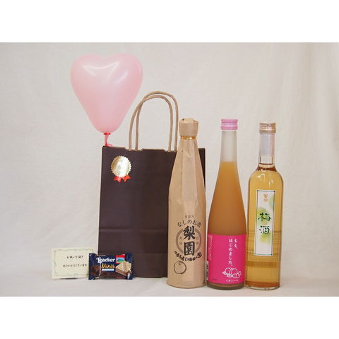 贈り物セット 果物リキュール3本セット もも梅酒(福岡県) 梨リキュール(大分県) 梅酒(大分県)合計500ml×3本 メッセージカード ハート風船 ミニチョコ付き