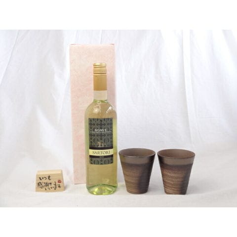贈り物ギフトセット 榮田 清峰作直筆メッセージ木片付ペアカップセット(陶芸作家安藤嘉規作 日本製萬古焼き) ワイン サルトーリ ソアーヴェ 白ワイン 750ml(イタリア)