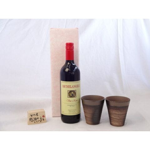 贈り物ギフトセット 榮田 清峰作直筆メッセージ木片付ペアカップセット(陶芸作家安藤嘉規作 日本製萬古焼き) 赤ワイン ミケランジェロ 750ml(イタリア)