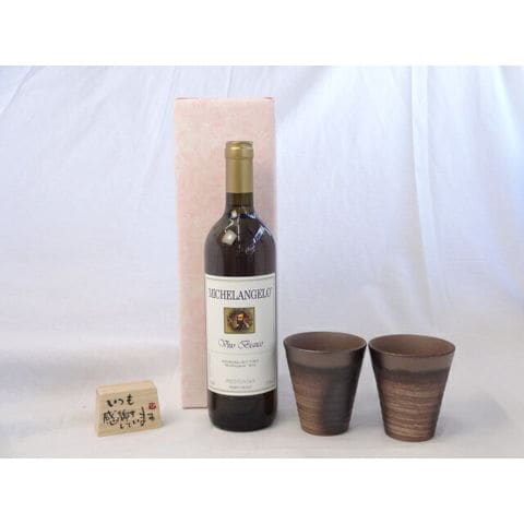 贈り物ギフトセット 榮田 清峰作直筆メッセージ木片付ペアカップセット(陶芸作家安藤嘉規作 日本製萬古焼き) 白ワイン ミケランジェロ 750ml(イタリア)