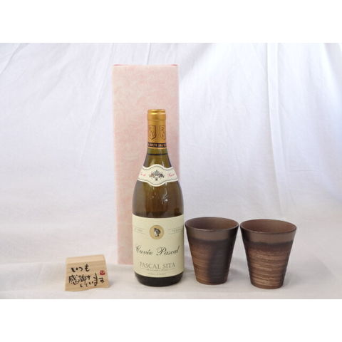 贈り物ギフトセット 榮田 清峰作直筆メッセージ木片付ペアカップセット(陶芸作家安藤嘉規作 日本製萬古焼き) 白ワイン パスカル シータ キュヴェブラン(フランス)750ml