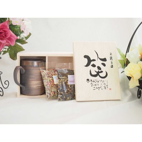 誕生日8月28日セット おたんじょうびおめでとうございます 笑う門には福来たる木箱珈琲マグカップセット(国産備前金彩マグカップとリフレッシュ紅茶茶葉2セット(リフレッシュブレンド20gアールグレイ40g)陶芸作家 安藤嘉規作×デザイン書道家 榮田 清峰作