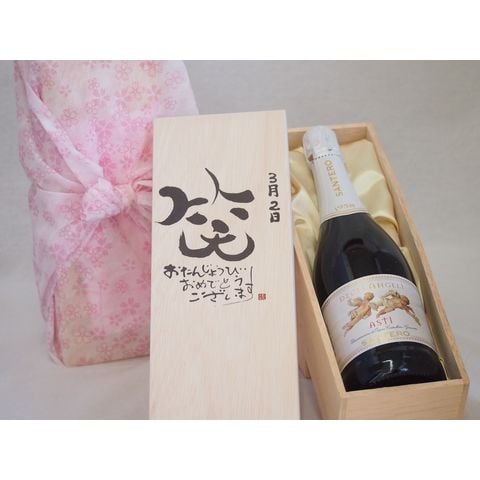 誕生日3月2日セット おたんじょうびおめでとうございます 笑う門には福来たる天使のアスティ イタリアスパークリングワイン(甘口)750ml デザイン書道家 榮田 清峰作