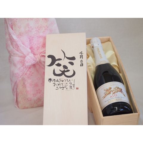 誕生日4月8日セット おたんじょうびおめでとうございます 笑う門には福来たる天使のアスティ イタリアスパークリングワイン(甘口)750ml デザイン書道家 榮田 清峰作