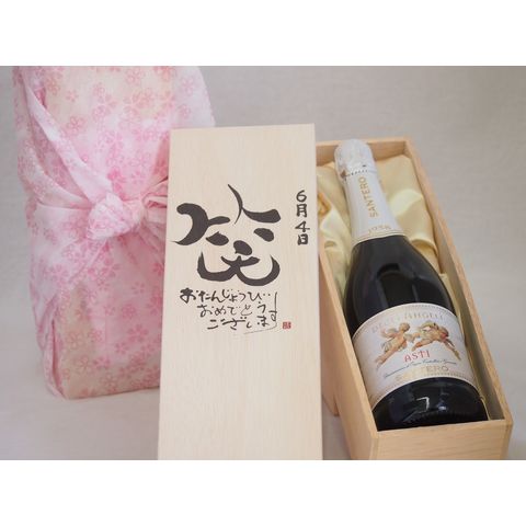 誕生日6月4日セット おたんじょうびおめでとうございます 笑う門には福来たる天使のアスティ イタリアスパークリングワイン(甘口)750ml デザイン書道家 榮田 清峰作