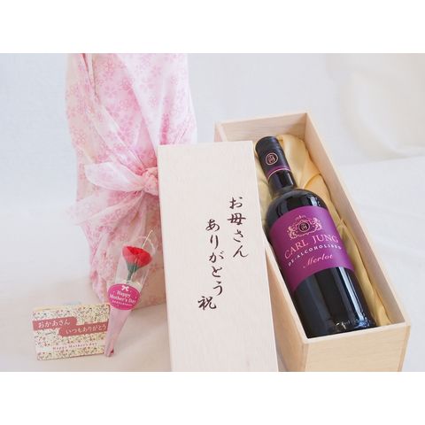 母の日 お母さんありがとう木箱セット ノンアルコールワインカールユングメルローやや軽口 (ドイツ) 750ml 母の日カードとカーネイション付