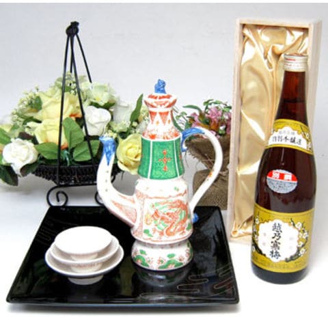 プレミアム日本酒とそ器セット 萬古焼きお屠蘇5点セット岸寿美子デザインB(盆黒)+石本酒造 別撰 越乃寒梅 吟醸酒720ml桐箱入り(日本酒)(日本製万古焼き(三重県))