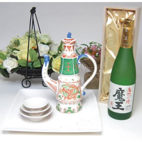 プレミアム焼酎とそ器セット 萬古焼きお屠蘇5点セット岸寿美子デザインA(盆白)+本格芋焼酎 魔王 720ml桐箱入り(焼酎)(日本製万古焼き(三重県))