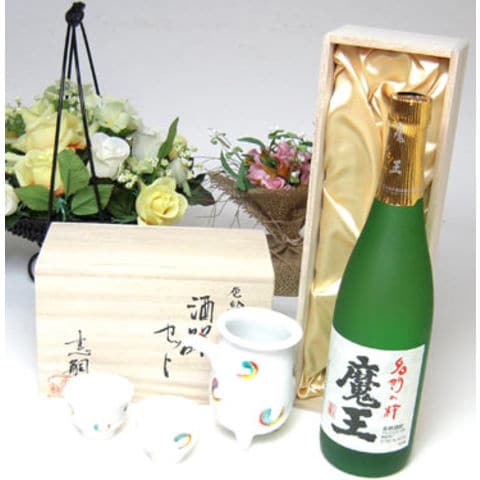プレミアム焼酎とそ器セット 萬古焼き酒器セット陶芸作家 岸 憲嗣作 3点セット(直筆木箱入り)+本格芋焼酎 魔王 720ml桐箱入り(焼酎)(日本製万古焼き(三重県))