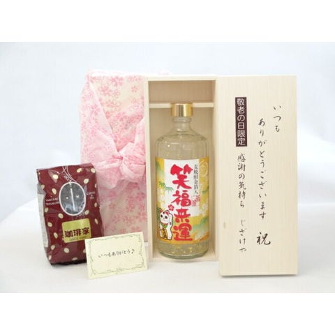 じいじの敬老の日 ギフトセット 焼酎セット いつもありがとうございます感謝の気持ち木箱セット+オススメ珈琲豆(特注ブレンド200g)( 老松酒造 笑福来運 麦焼酎金箔入り 25° 720ml(大分県) ) メッセージカード付