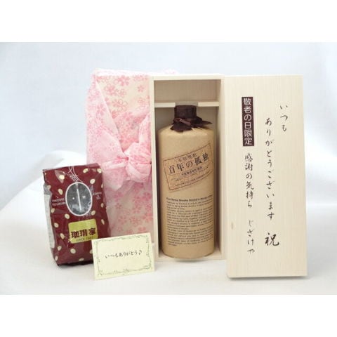 じいじの敬老の日 ギフトセット 焼酎セット いつもありがとうございます感謝の気持ち木箱セット+オススメ珈琲豆(特注ブレンド200g)( 黒木本店 大麦製長期貯蔵酒 百年の孤独 720ml(宮崎県)) メッセージカード付