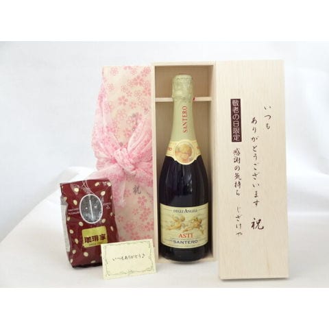 じいじの敬老の日 ギフトセット ワインセット いつもありがとうございます感謝の気持ち木箱セット+オススメ珈琲豆(特注ブレンド200g)( 天使のアスティ・スプマンテ スパークリングイタリアワイン(甘口)750ml) )メッセージカード付