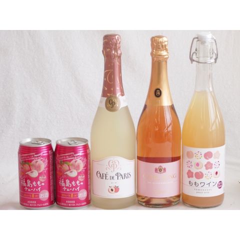 5本セット(山梨県ももワイン カフェ ド パリ ピーチスパークリング(フランス) 脱アルコールカールユングピーチ(ドイツ) 福島もものチューハイ缶) 720ml×1本 750ml×2本 350ml×2本