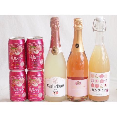 桃のお酒を楽しめる7本セット(山梨県ももワイン カフェ ド パリ ピーチスパークリング(フランス) 脱アルコールカールユングピーチ(ドイツ) 福島もものチューハイ缶) 720ml×1本 750ml×2本 350ml×4本