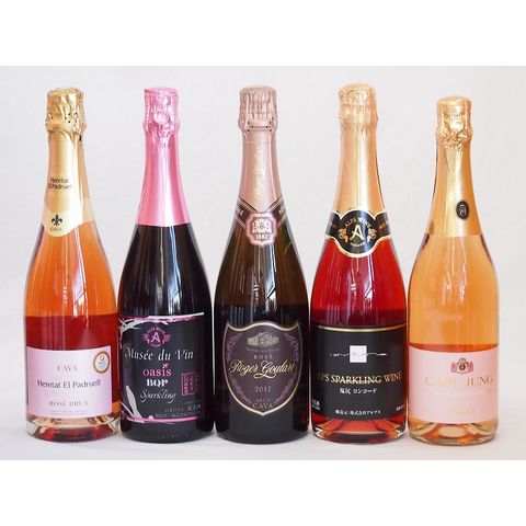 果実味豊かなロゼスパークリングワイン5本セット(塩尻コンコード スパークリングロゼやや甘口 シャンパーニュ製法エレタットロゼ(スペイン) ドイツ脱アルコールスパークリングロゼやや辛口 ミュゼドゥヴァン ブラッククイーンピンク辛口 ロジャー グラート カヴ
