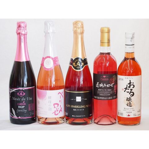 果実味豊かなロゼスパークリングワイン5本セット(塩尻コンコード スパークリングロゼやや甘口 おたる醸造キャンベルアーリロゼ甘口 ミュゼドゥヴァン ブラッククイーンピンク辛口 酵母の泡ベーリーAロゼ やや辛口 勝沼ワインバレー遅摘み甘口ロゼ) 720ml×