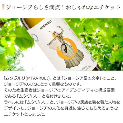 ワイン発祥の地といわれています。 近年国際的な注目を浴びており、世界中のワイン愛好家に愛されています。 そんなジョージアワインの中から、実際にソムリエが飲み比べ、 本当においしいワインを輸入しました。 当店のグループ企業がワイナリーから直接輸入し、大幅にマージンをカット! お客様の元にお値打ちにお届けいたします! その昔、クレオパトラもジョージアワインを 愛飲していたと言われています。 政治政権を維持するのに強い不安を抱えていたのだとか。 その不安や孤独を紛らわすために、夜な夜なクレオパトラは、ジョージアワインを飲みながら涙したといわれています。 その逸話からジョージアワインは「クレオパトラの涙」とも呼ばれているのです。 品種と主要産地 ジョージアで栽培されている古い品種で主要産地はカヘティ地方。 ジョージア語で「染める、着色する」を意味する「サペラヴィ」は晩熟で、寒冷な気候にも耐えることができます。 果肉は赤く、アントシアニンが豊富に含まれ、ワインは濃い色合いを持つことが特徴です。 香味の特徴/風味 サペラヴィから作られるワインは、辛口から甘口、ロゼから 酒精強化ワインまで、様々なスタイルが存在します。 高い酸味と豊富なタンニンを持ち、高品質で熟成能力のあるワインが生まれます。香りには黒系果実、リコリス、スパイス、タバコ、チョコレートなどがあり、テロワール(土地の特性)を反映。 地域によって香りプロファイルが異なり、冷涼な場所では赤系果実が支配的でエレガントなワインに、暖かい場所では黒系果実や肉の風味が現れ、アルコール度数も高くなります。 「ムタヴルリ(MTAVRULI)」とは「ジョージア語の文字」のこと。 ジョージアの文化にとって重要なものです。 そのため生産者はジョージアのアイデンティティの構成要素である「ムタヴルリ」と名付けました。 ラベルには「ムタヴルリ」と、ジョージアの民族衣装を着た人物をデザインし、ジョージアの文化を身近に感じてもらえるようなエチケットとしました。 ■メーカー:テリアニ・ヴァレー ■生産地:ジョージア カヘティ州テラヴィ ■ブドウ品種:サぺラヴィ100% ■アルコール度数:12.5% カヘティ州内の畑で栽培されたルカツィテリ100%で造られた 中甘口の白ワイン。色調は明るい藁色。熟した白桃やホワイトチェリーの ジャムのようなアロマが先行します。 程よい甘さと酸味のバランスが良くとれた飲みやすい白ワインです。 ワインを良く冷やした状態でサラダやチーズ、豚肉料理などと合わせて 頂くのがおすすめです♪ テリアニ・ヴァレー ワイン造りの歴史は8000年にも及び500以上もの土着品種が存在すると言われる国「ジョージア」では バラエティに富んだワインが製造されています。 そのジョージアの銘醸地「カヘティ州」に位置するテリアニ・ヴァレーは、 確かな経験・知識と科学的根拠に基づいた活気あふれるワイン造りを行っているワイナリー。 生みだされるワインはフレッシュでどのようなシーンでも楽しめ、我々の生活に寄り添ってくれます。 土日・祝日は休業日となります。 お値下げの交渉はしておりませんので、お問い合わせはご遠慮願います。 ★20歳未満の飲酒は法律で禁止されています。20歳未満の方に対しては酒類は販売いたしません。