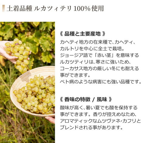 カヘティ州内の畑で栽培されたルカツィテリ100%で造られた