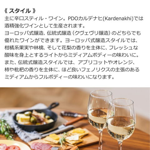 《 品種と主要産地 》 カヘティ地方の在来種で、カヘティ、カルトリを中心に全土で栽培されています。ジョージア語で「赤い茎」を意味するルカツティリは、芽吹きが遅い品種で寒さに強いため、コーカサス地方の厳しい冬にも耐える事ができます。ベト病のような病害にも強いものの、暖かく湿度が高い西ジョージアより東ジョージアの方が栽培には適しています。 《 香味の特徴/風味 》 酸味が高く、暑い夏でも酸を保持する事ができます。 香りが控えめなため、アロマティックなムツヴァネ・カフリとブレンドされる事があります。 《 スタイル 》 主に辛口スティル・ワイン。PDOカルデナヒ(Kardenakhi)では酒精強化ワインとして生産されます。ヨーロッパ式醸造、伝統式醸造(クヴェヴリ醸造)のどちらでも優れたワインができます。 ヨーロッパ式醸造スタイルでは、柑橘系果実や林檎、そして花梨の香りを主体に、フレッシュな酸味を身上とするライトからミディアムボディーの味わいに。また、伝統式醸造スタイルでは、アプリコットやオレンジ、柿や枇杷の香りを主体に、ほど良いフェノリクスの主張のあるミディアムからフルボディーの味わいになります。 「ムタヴルリ(MTAVRULI)」とは「ジョージア語の文字」のこと。 ジョージアの文化にとって重要なものです。 そのため生産者はジョージアのアイデンティティの構成要素である 「ムタヴルリ」と名付けました。 ラベルには「ムタヴルリ」と、ジョージアの民族衣装を着た人物を デザインし、ジョージアの文化を身近に感じてもらえるような エチケットとしました。  ■メーカー:テリアニ・ヴァレー  ■生産地:ジョージア カヘティ州テラヴィ  ■ブドウ品種:ルカツィテリ100%  ■アルコール度数:12.0% カヘティ州内の畑で栽培されたルカツィテリ100%で造られた 中甘口の白ワイン。色調は明るい藁色。熟した白桃やホワイトチェリーの ジャムのようなアロマが先行します。 程よい甘さと酸味のバランスが良くとれた飲みやすい白ワインです。 ワインを良く冷やした状態でサラダやチーズ、豚肉料理などと合わせて 頂くのがおすすめです♪ 《 品種と主要産地 》 ジョージアで栽培されている古い品種で主要産地はカヘティ地方。 ジョージア語で「染める、着色する」を意味する「サペラヴィ」は晩熟で、寒冷な気候にも耐えることができます。 果肉は赤く、アントシアニンが豊富に含まれ、ワインは濃い色合いを持つことが特徴です。 《 香味の特徴/風味 》 サペラヴィから作られるワインは、辛口から甘口、ロゼから 酒精強化ワインまで、様々なスタイルが存在します。 「ムタヴルリ(MTAVRULI)」とは「ジョージア語の文字」のこと。 ジョージアの文化にとって重要なものです。 そのため生産者はジョージアのアイデンティティの構成要素である「ムタヴルリ」と名付けました。 ラベルには「ムタヴルリ」と、ジョージアの民族衣装を着た人物をデザインし、ジョージアの文化を身近に感じてもらえるようなエチケットとしました。 ■メーカー:テリアニ・ヴァレー ■生産地:ジョージア カヘティ州テラヴィ ■ブドウ品種:サぺラヴィ100% ■アルコール度数:12.5% カヘティ州内の畑で栽培されたサぺラヴィ100%で造られた 中甘口の赤ワイン。ザクロ様の色調に赤系果実やブラックベリーなどの フレッシュなアロマが感じられます。 甘さと程よい酸味のバランスが良くとれた飲みやすい赤ワインです。 良く冷やした状態でフルーツやケーキなどのスイーツと一緒に楽しむのも おすすめです♪ 土日・祝日は休業日となります。 お値下げの交渉はしておりませんので、お問い合わせはご遠慮願います。 ★20歳未満の飲酒は法律で禁止されています。20歳未満の方に対しては酒類は販売いたしません。