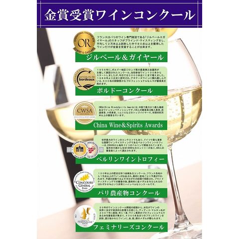 ヨーロッパには味わいを競うコンクールが数多くあり、出品されるワインは生産者が丹精込めた自信作ばかりです。 そんなワインを審査するのは、ソムリエやジャーナリストなど、ワインのプロフェッショナル。 そのプロ中のプロが選び抜いた金賞受賞ワインをそろえた、フランス産金賞セット! 土日・祝日は休業日となります。 お値下げの交渉はしておりませんので、お問い合わせはご遠慮願います。 ★20歳未満の飲酒は法律で禁止されています。20歳未満の方に対しては酒類は販売いたしません。