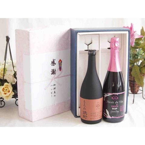 春の贈り物便り 感謝の贈り物ボックス 酒粕だけの焼酎と国産ワインセット(MdV オアシス ブラッククイーンピンクロゼスパークリングワイン辛口(長野県)750ml大分県井上酒造もろみ焼酎32度 720ml