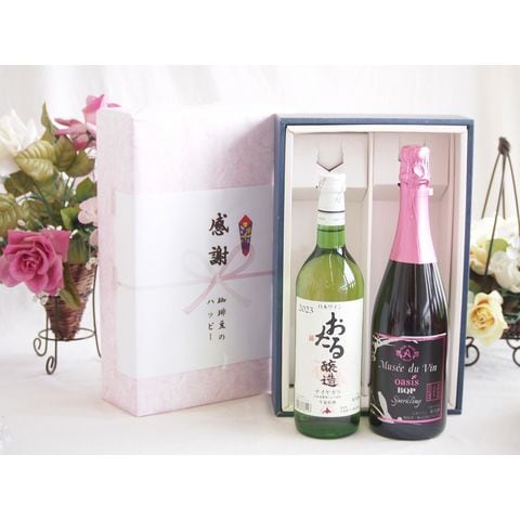 春の贈り物便り 感謝の贈り物ボックス おたる生葡萄100%ナイアガラワインと国産ワイン2本セット(MdV オアシス ブラッククイーンピンクロゼスパークリングワイン辛口(長野県)750mlナイアガラ白ワイン やや甘口(北海道)720ml