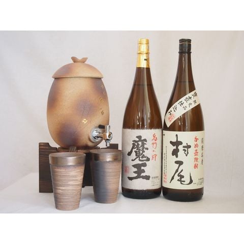 信楽焼・明山窯 焼酎サーバー 火色金小紋 2200cc(滋賀県)+萬古焼・備前金彩焼酎ペアカップ(三重県)+芋焼酎セット 村尾1800ml 魔王1800ml(鹿児島)